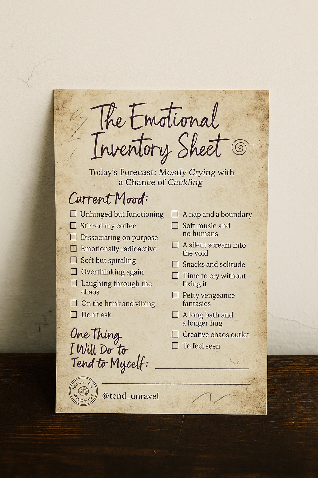 A one-page printable from Tend & Unravel — for when you need to track your chaos with humor and witchy momcore vibes. Print it at home, mark it up on your iPad, or tape it to your fridge as proof you’re still spiraling softly.